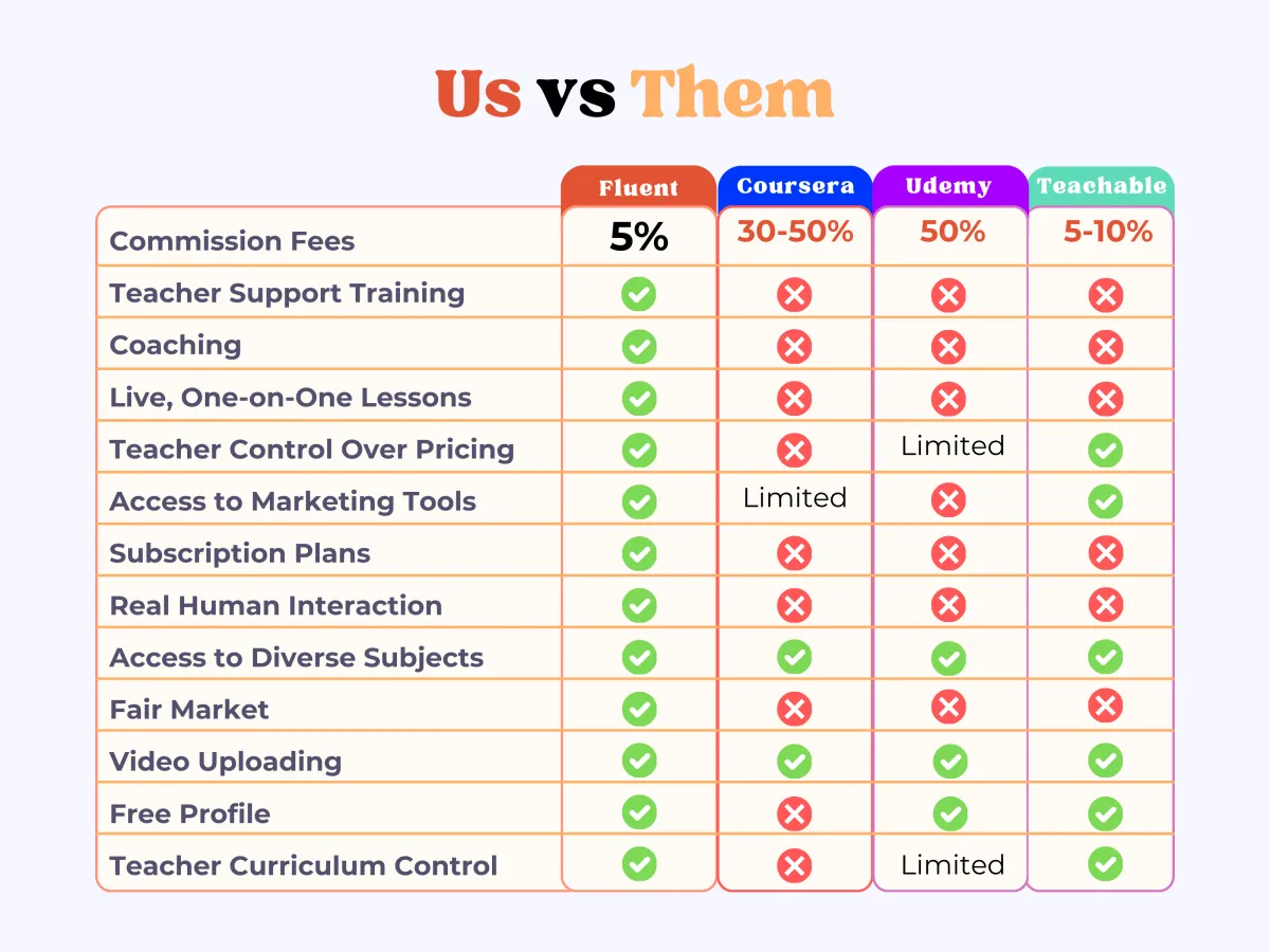At The Fluent World, we believe teachers deserve to keep more of what they earn. That’s why we’re offering an exclusive opportunity for the first 1,000 teachers who join our platform— you will never pay a subscription fee, ever.